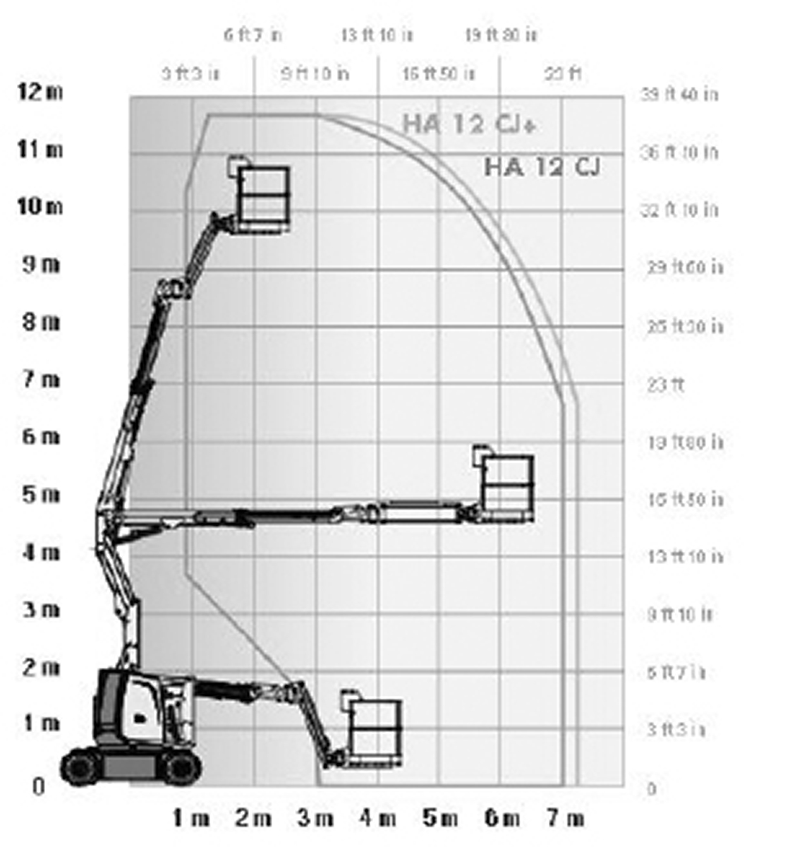 Arbeitshöhe 11.70 Plattformhöhe 9.70 Plattformgröße 1,14 x 0,8 x 1,10 m Bühnentragkraft 230 kg Drehbereich 355° Korb schwenkbar 180° (+90°/-90°) Seitliche Reichweite 7,22 m Durchfahrthöhe 1,99 m Fahrzeugbreite 1,20 m Fahrzeuglänge 5,64 m Eigengewicht 7110 kg Antrieb elektrisch Sonstiges helle Bereifung /nichtmarkierend, kein Drehwagen- überhang, Korbarm horizontal um 180° schwenkbar, Schrägstand bis 3°, Knickpunkthöhe: 4,74 m Führerscheinklasse kein Führerschein erforderlich -