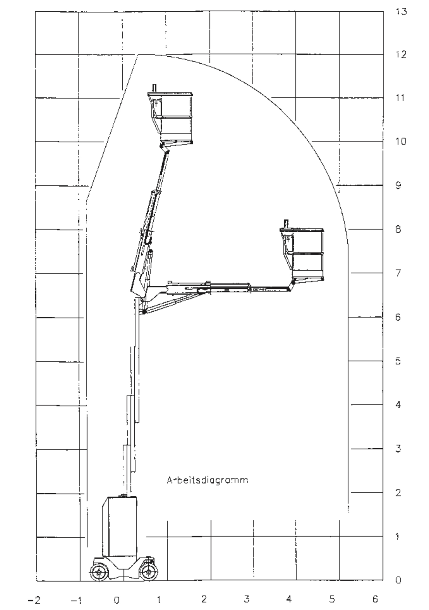 Arbeitshöhe 12.00 Plattformhöhe 10.00 Plattformgröße 0,9 x 0,7 x 1,10 m Bühnentragkraft 200 kg Drehbereich 355° Seitliche Reichweite 5,15 m Durchfahrthöhe 1,99 m Fahrzeugbreite 0,98 m Fahrzeuglänge 3,36 m Eigengewicht 4800 kg Antrieb elektrisch / Batterie Sonstiges 10 % Steigfähigkeit; geringer Wenderadius durch Lenkeinschlag 87°, nicht markierende Bereifung, auch als Montagekran bis 500 kg Tragkraft möglich Führerscheinklasse kein Führerschein erforderlich -
