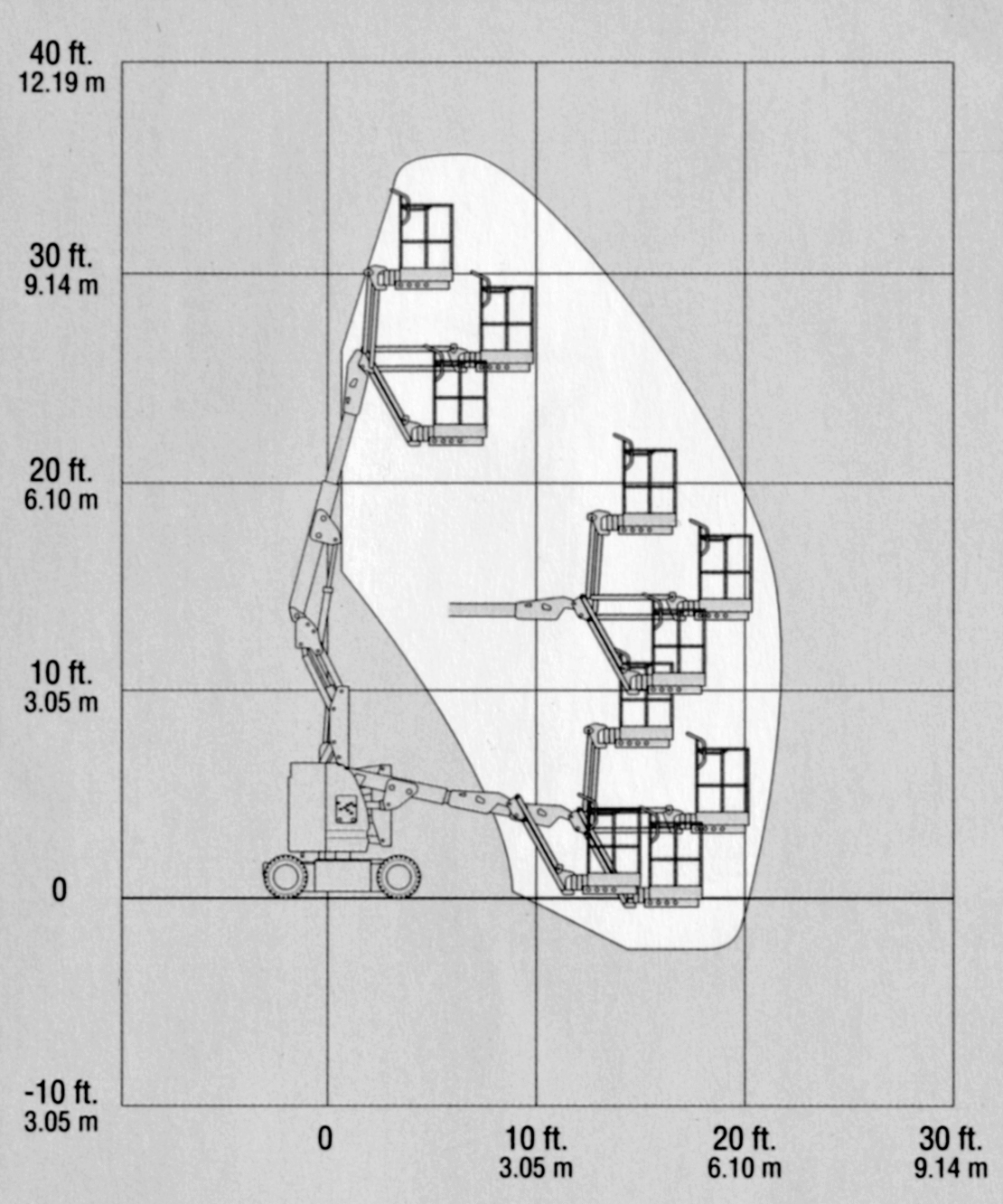 Sonstiges Korbarm horizontal um 140° schwenkbar;  Maschine 360° in Fahrbreite schwenkbar, nicht markierende Bereifung