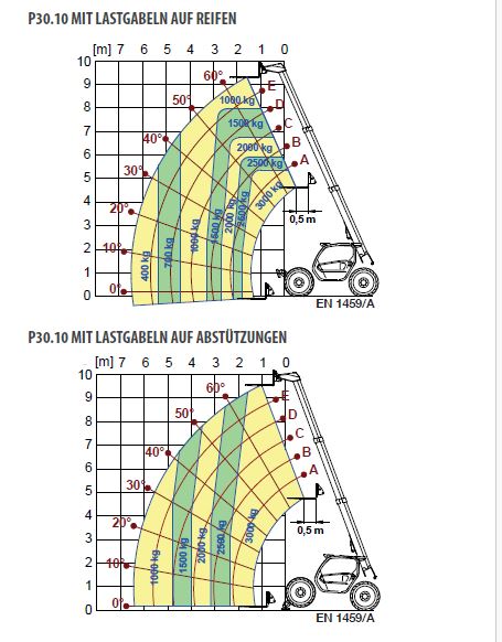 Antrieb 4x4-Allrad Führerscheinklasse kein Führerschein erforderlich Technische Daten 30.10 L Max. Hubhöhe 8,20 m Max. Tragkraft 3000 kg Max. Reichweite 6,50 m Tragfähigkeit bei max. Höhe 3000 kg Max. Höhe bei max. Gewicht 9,60 m Abstützbreite 2,20 m Transporthöhe 2,02 m Transportbreite 2,10 m Transportlänge ohne Gabeln 4,60 m Eigengewicht 7100 kg Antrieb Diesel 4x4 Sonstiges Gabelverlängerung, beide Achsen lenkbar -