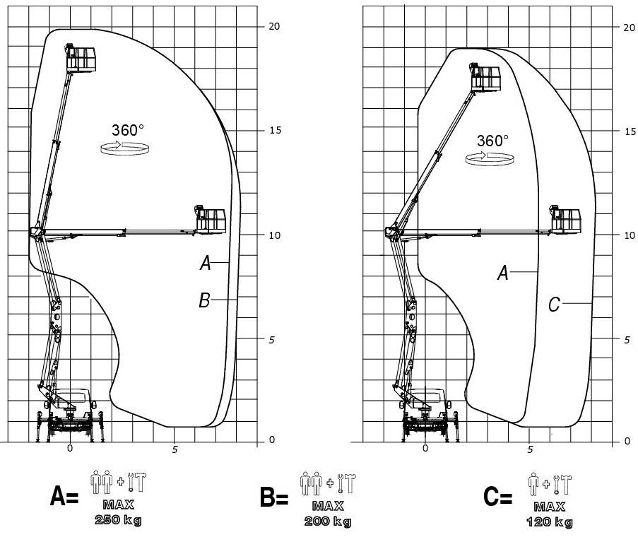 Arbeitshöhe 19.90 m Plattformhöhe 17.90 m Plattformgröße 1,4 x 0,7 x 1,1 m Bühnentragkraft max 250 kg Drehbereich 360° Korb schwenkbar 2 x 90° Seitliche Reichweite 8,40 m (100 kg) Abstützbreite mind. 2,20 m / max. 3,13 m Durchfahrthöhe 2,90 m Fahrzeugbreite 2,20 m Fahrzeuglänge 7,58 m Eigengewicht 3500 kg Antrieb LKW-Motor Sonstiges Mit H-Abstützung, 1-seitige oder bündige Abstützung möglich, Abstützautomatik Führerscheinklasse Klasse B -