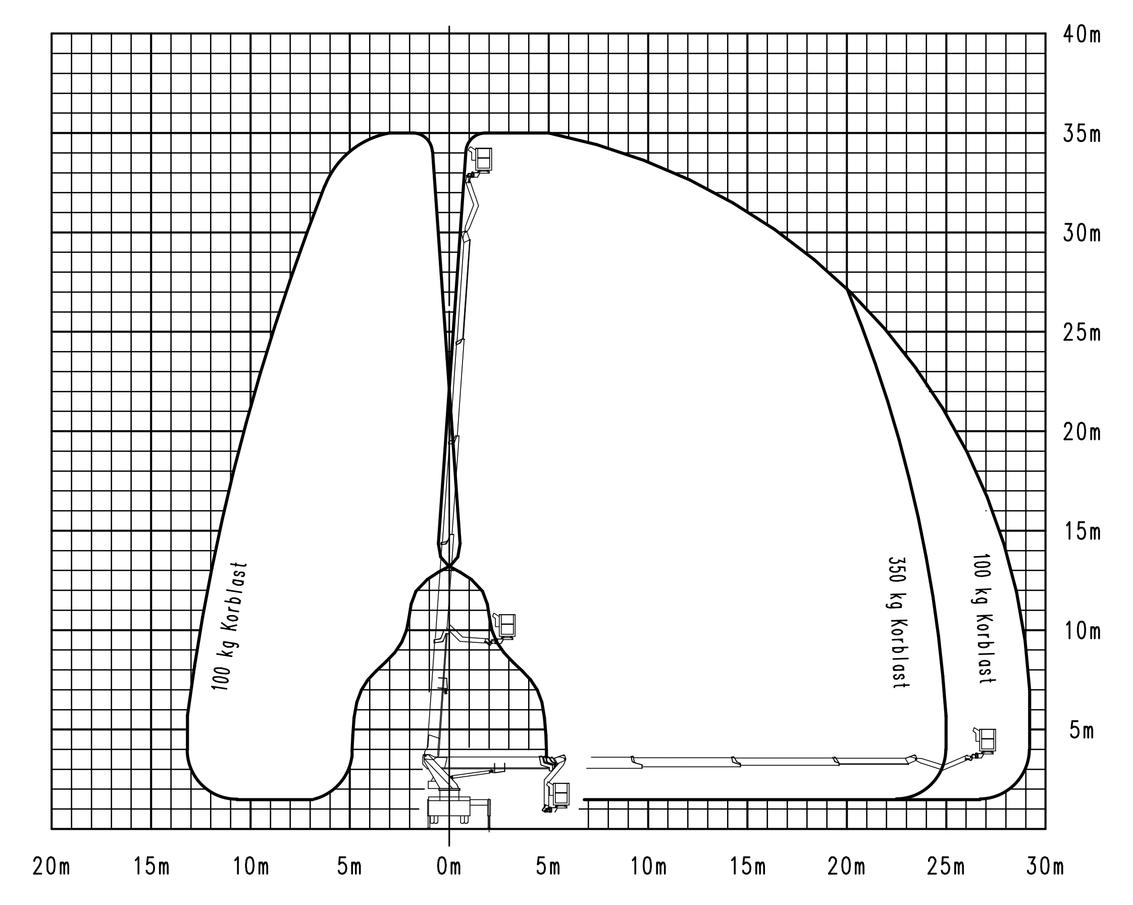 Arbeitshöhe 35.00 Plattformhöhe 33.00 Plattformgröße 1,80 x 0,90 x 1,10 m Bühnentragkraft 350 kg Drehbereich 540° Korb schwenkbar 2 x 80° Seitliche Reichweite 29,40 m bei 100 kg Korblast 25 m bei 350 kg Korblast Abstützbreite min. 2,55 m / max. 6,00 m Durchfahrthöhe 3,90 m Fahrzeugbreite 2,55 m Fahrzeuglänge 9,30 m Eigengewicht 15000 kg Antrieb 4x4-Allrad Sonstiges Baumschneidekorb u. Polyesterkorb mit 1000 Volt Isolierung möglich, voll variable Abstützung Führerscheinklasse Klasse C -