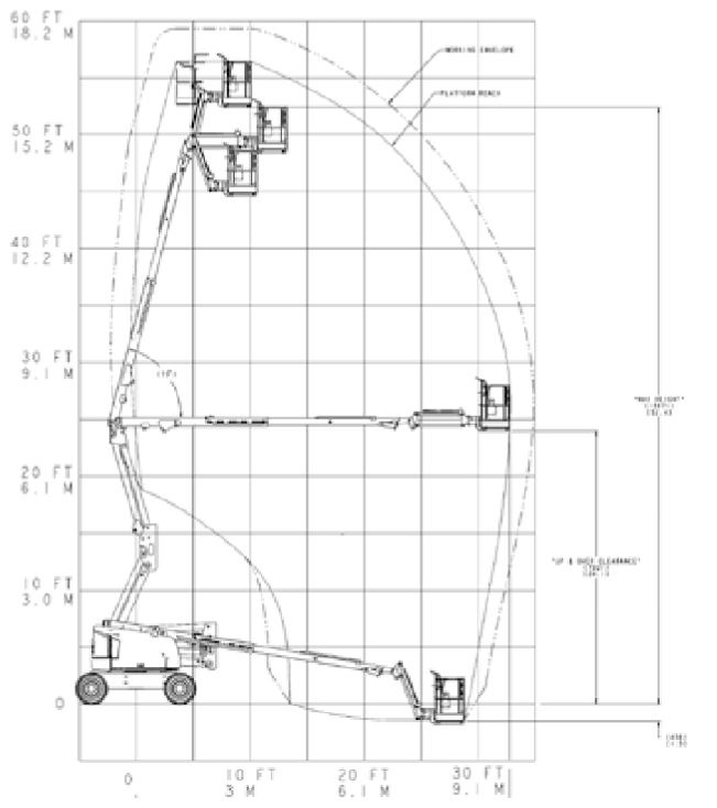 Arbeitshöhe 18.00 m Plattformhöhe 16.00 m Plattformgröße 1,83 x 0,76 m Bühnentragkraft 250 kg Drehbereich 355° Korb schwenkbar 180° Seitliche Reichweite 10,65 m Durchfahrthöhe 2,27 m Fahrzeugbreite 2,35 m Fahrzeuglänge 7,77 m Eigengewicht ca. 7985 kg Antrieb Diesel Sonstiges max. Steigfähigkeit 45 %, Knickpunkthöhe 7,30 m, Wenderadius außen 4,78 m Führerscheinklasse kein Führerschein erforderlich -